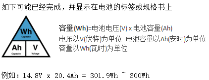 如果我们想知道以Wh(瓦时)为单位的容量,则需要进行以下计算: 电池电压(V) x 容量(Ah) = 容量(Wh)
