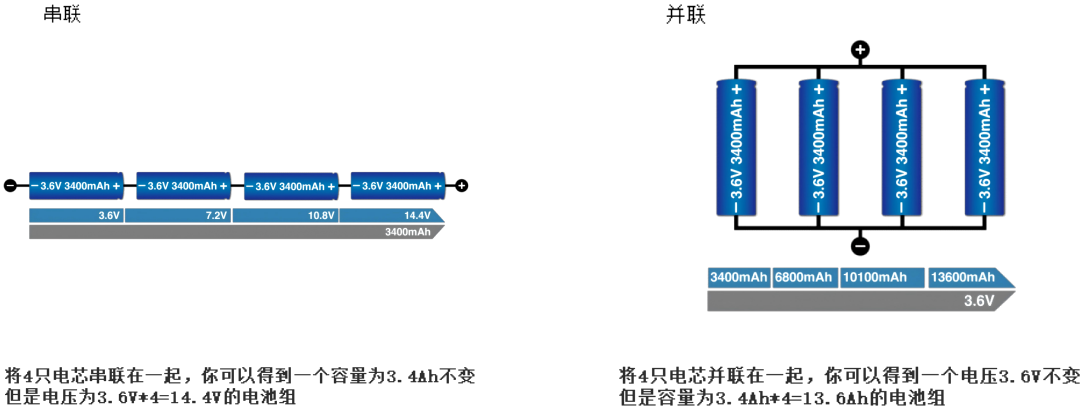 假设我们有四只额定电压为3.6V的电芯,容量为3400mAh(3.4Ah),我们用上述两种不同的方法将它们连接起来