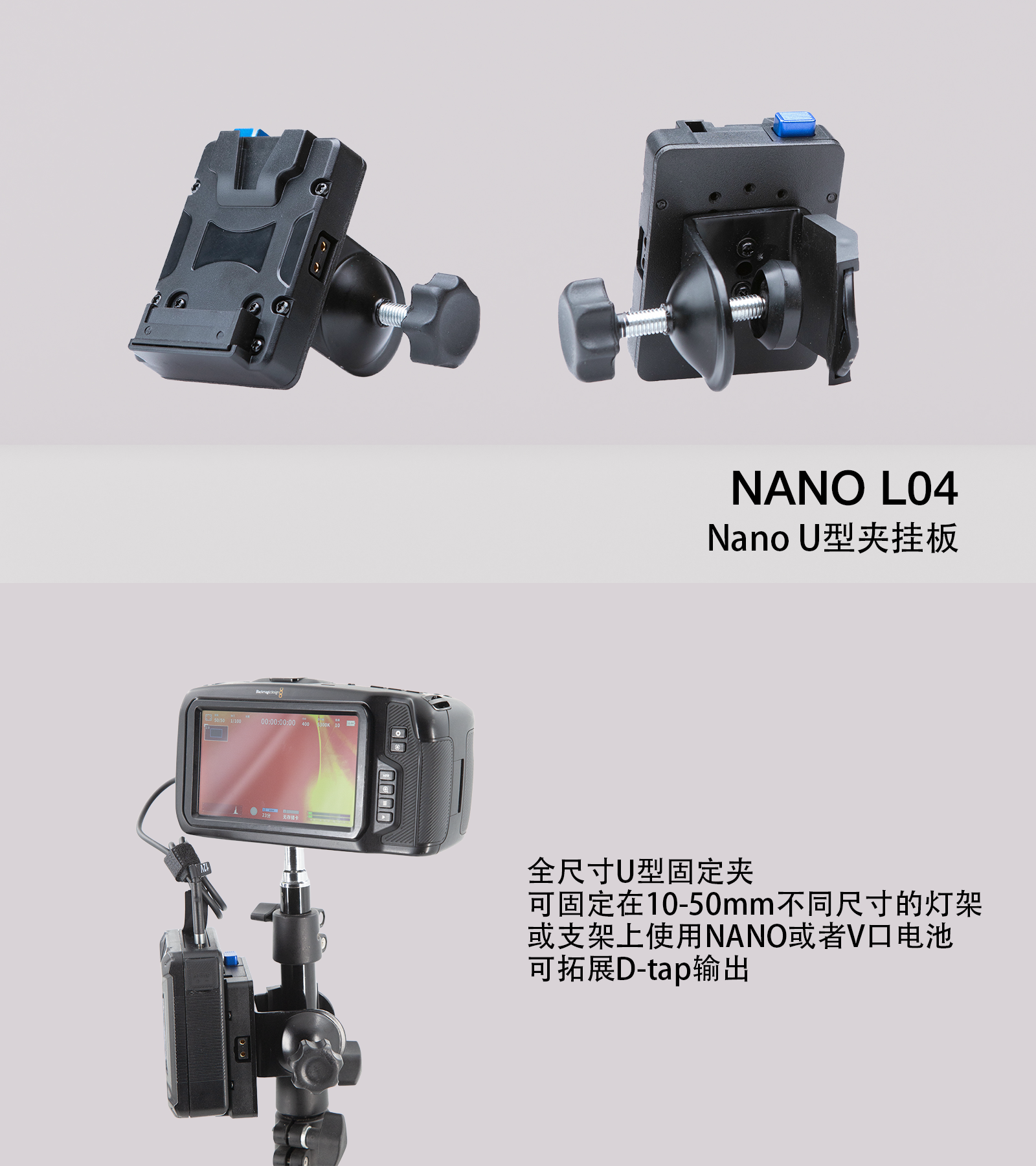 全尺寸U型固定夹,可固定在10-50mm不同尺寸的灯架或支架上