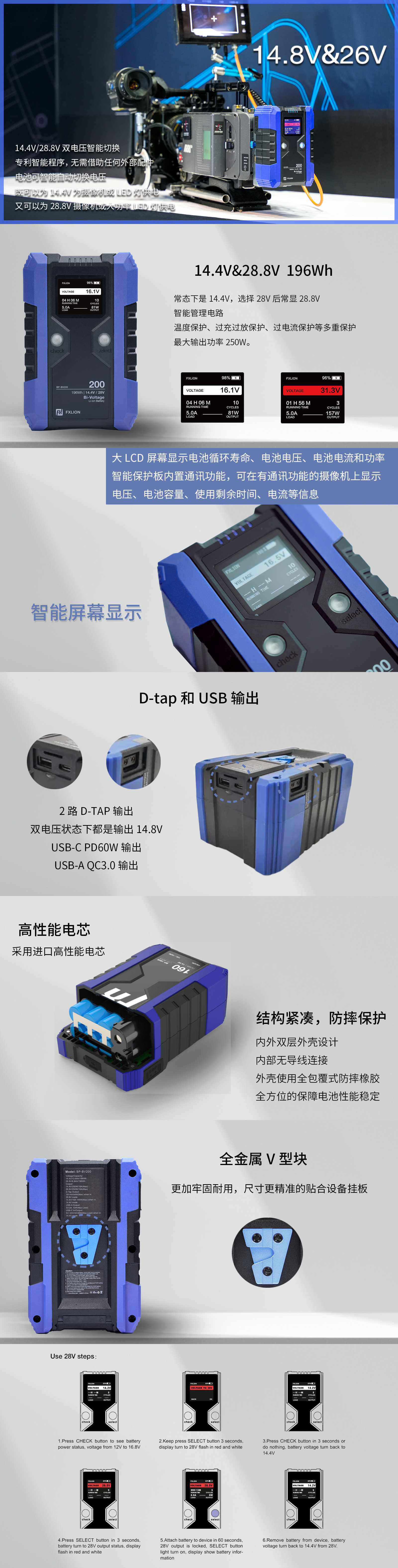 - 智能保护板内置通讯功能,匹配SONY/RED摄像机读取电池数据
